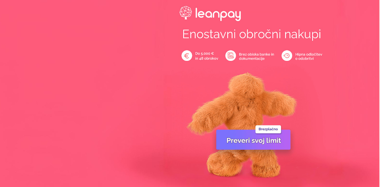 Leanpay omogoča hitro in enostavno obročno odplačevanje preko spleta. Za obročno plačilo v košarici izberi Leanpay. Popolnoma digitalno, brez skritih stroškov, brez papirologije, brez obiska banke, brez kreditne kartice.