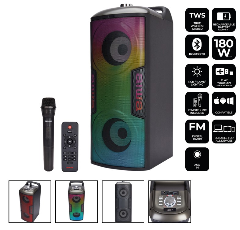 AIWA KBTUS-100 je ustvarjen za vse, ki želijo glasbo, zabavo in karaoke združiti v eni prenosni napravi. Opremljen je z dvema 4-palčnima HyperBass zvočnikoma, ki zagotavljata močan, čist in dinamičen zvok z izrazitimi nizkimi toni.