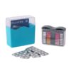 Tester JD ima praktično škatlico, v kateri so shranjeni barvni merilnik in reagentne tablete. Kompaktna oblika omogoča enostavno uporabo, hkrati pa ohranja reagente zaščitene pred vlago in svetlobo.