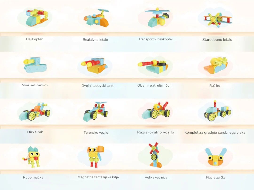 46 barvitih kosov z magnetnim sistemom za ustvarjanje vozil, živali in drugih modelov.