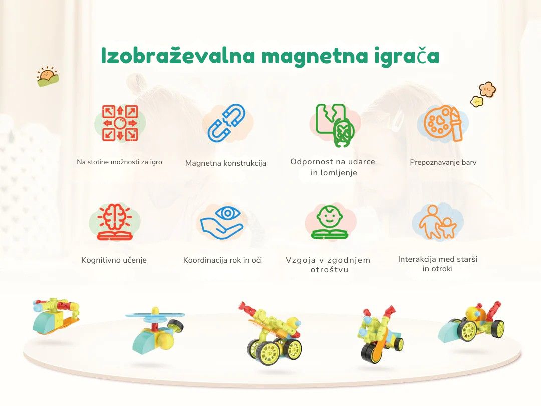 Magfun magnetni gradbeni bloki so več kot le igrača – so izobraževalno orodje, ki spodbuja ustvarjalnost, logično razmišljanje in koordinacijo. Ta 46-delni barviti set omogoča izdelavo 3D vozil, helikopterjev, vlakov, robotov in nešteto drugih modelov. Otroci se skozi igro učijo prepoznavanja barv, oblik in osnovnih konceptov konstrukcije.