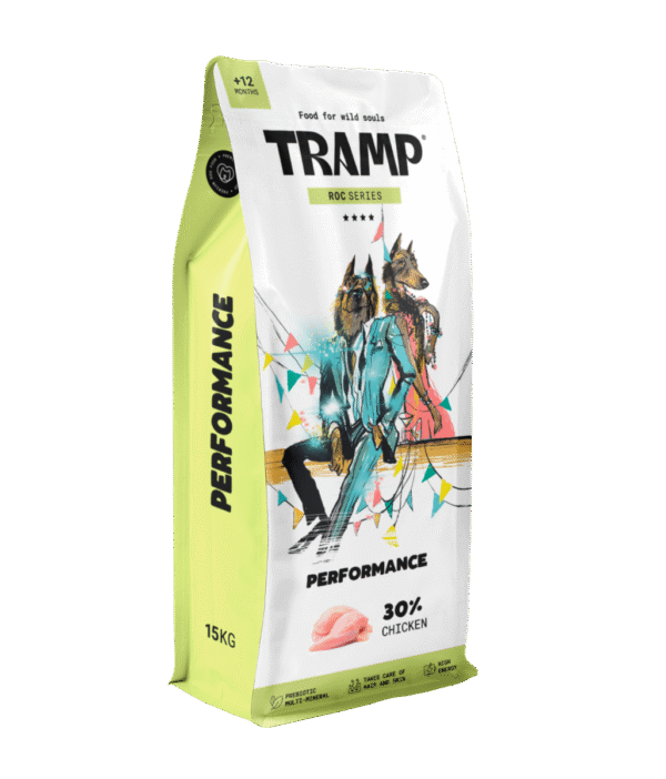 Tramp Roc Performance je visoko kakovostna suha hrana, namenjena odraslim psom z večjo potrebo po energiji in vzdržljivosti. Vsebuje visoko vrednost beljakovin iz dehidriranega piščanca ter lahko prebavljive ogljikove hidrate iz koruze, pšenice in riža, ki zagotavljajo dolgotrajno energijo. Obogatena je s prebiotiki, vitamini in minerali za podporo imunskemu sistemu, zdravju prebave ter splošni vitalnosti, zaradi česar je idealna izbira za aktivne in delovne pse.
